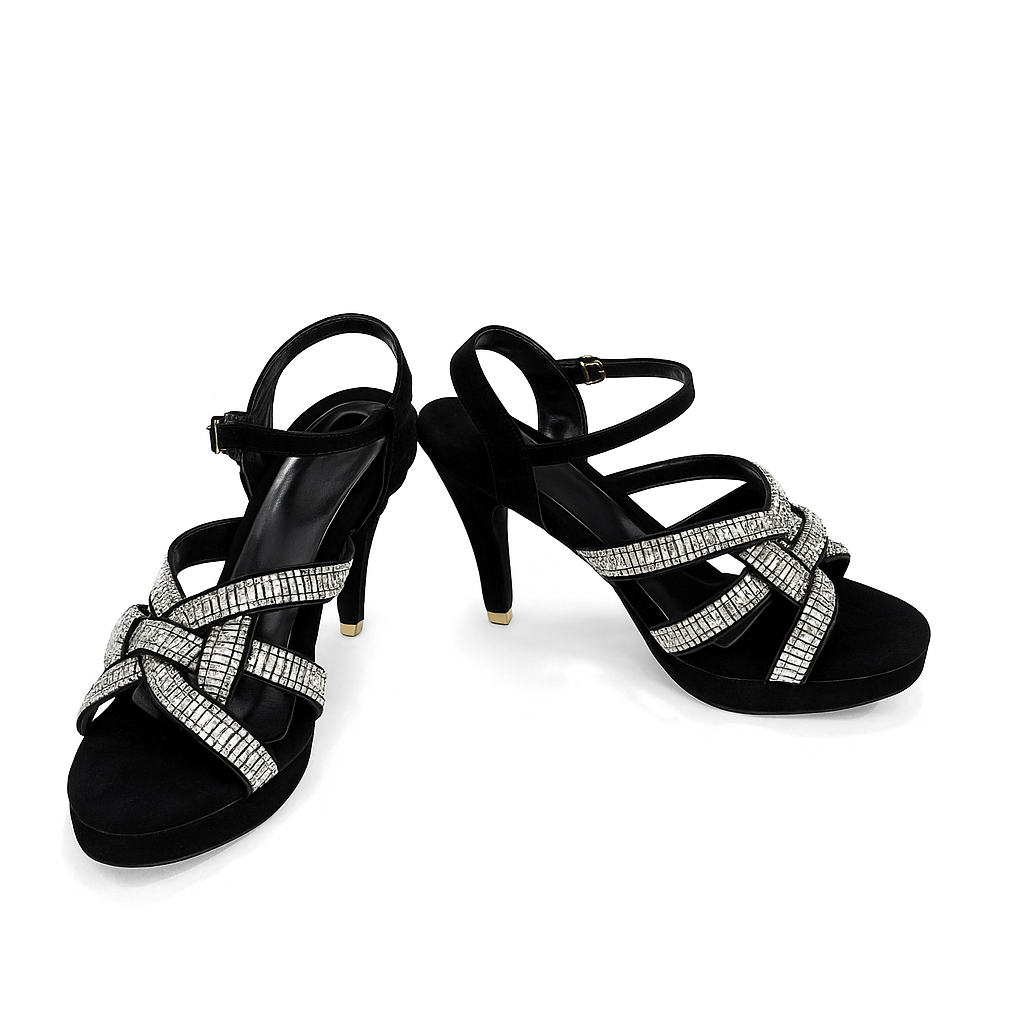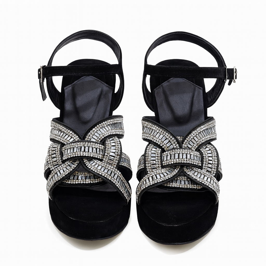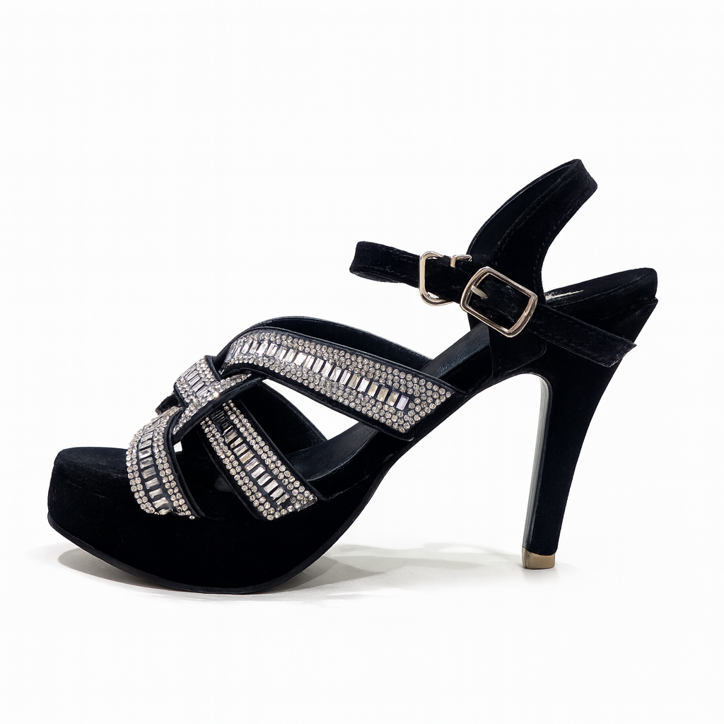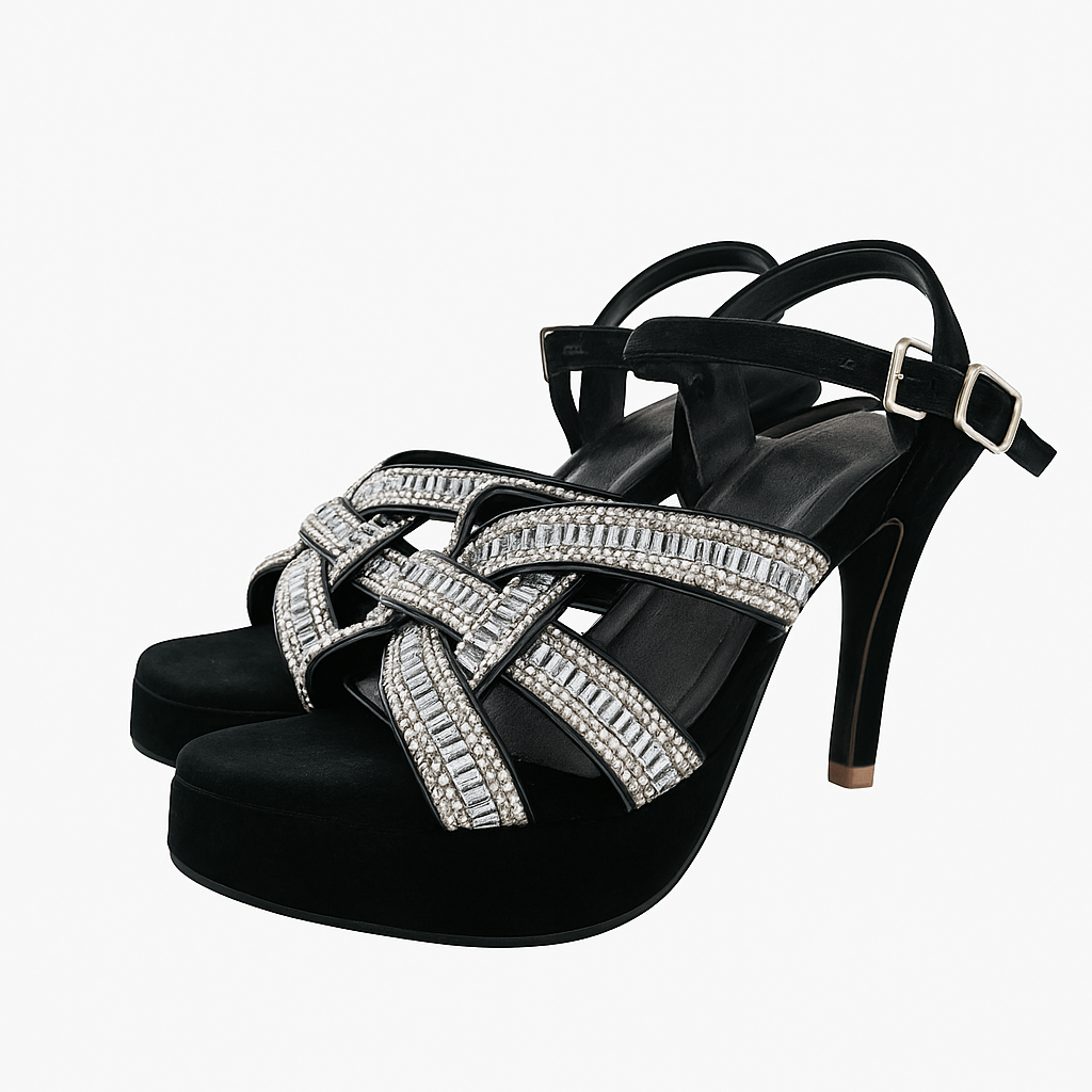 Step into luxury with Crystal Monarch, a statement heel designed for glamorous evenings and premium occasions. This elegant black pair features multi-layer crystal-embellished straps that shine beautifully with every step, paired with a velvet-textured base for a rich, sophisticated finish.