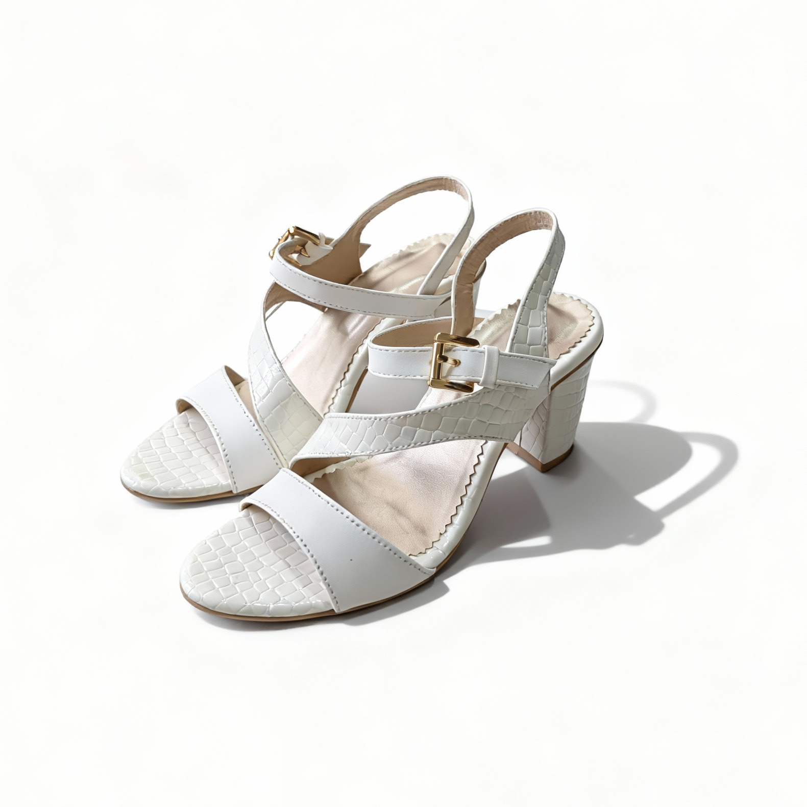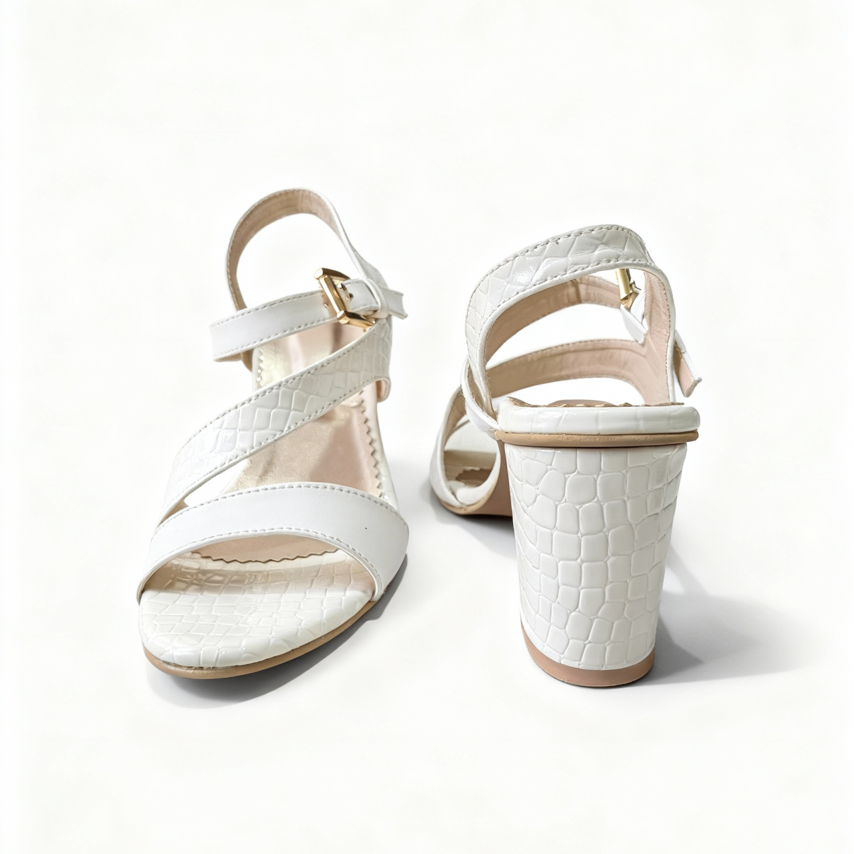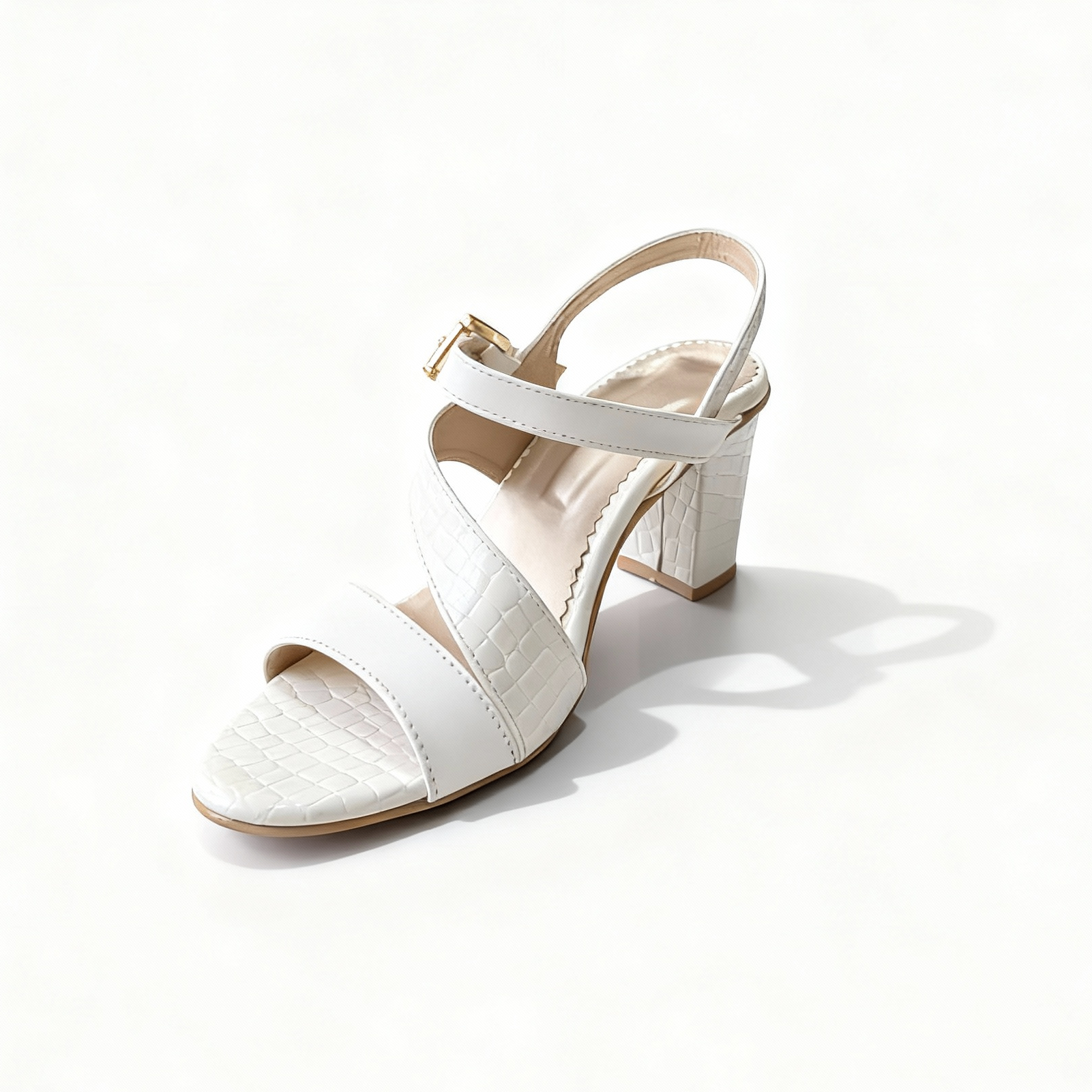 Ivory Crest brings a fresh, polished vibe with its beautiful white crocodile-textured finish and stylish cross-strap design. The mid block heel adds stability, while the cushioned footbed keeps every step comfortable. A gold buckle detail completes the refined look, making it the perfect pick for lunches, day events, and elevated casual styling.