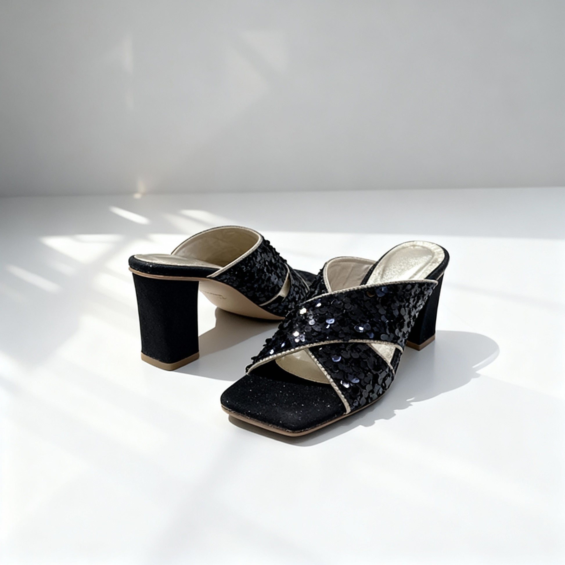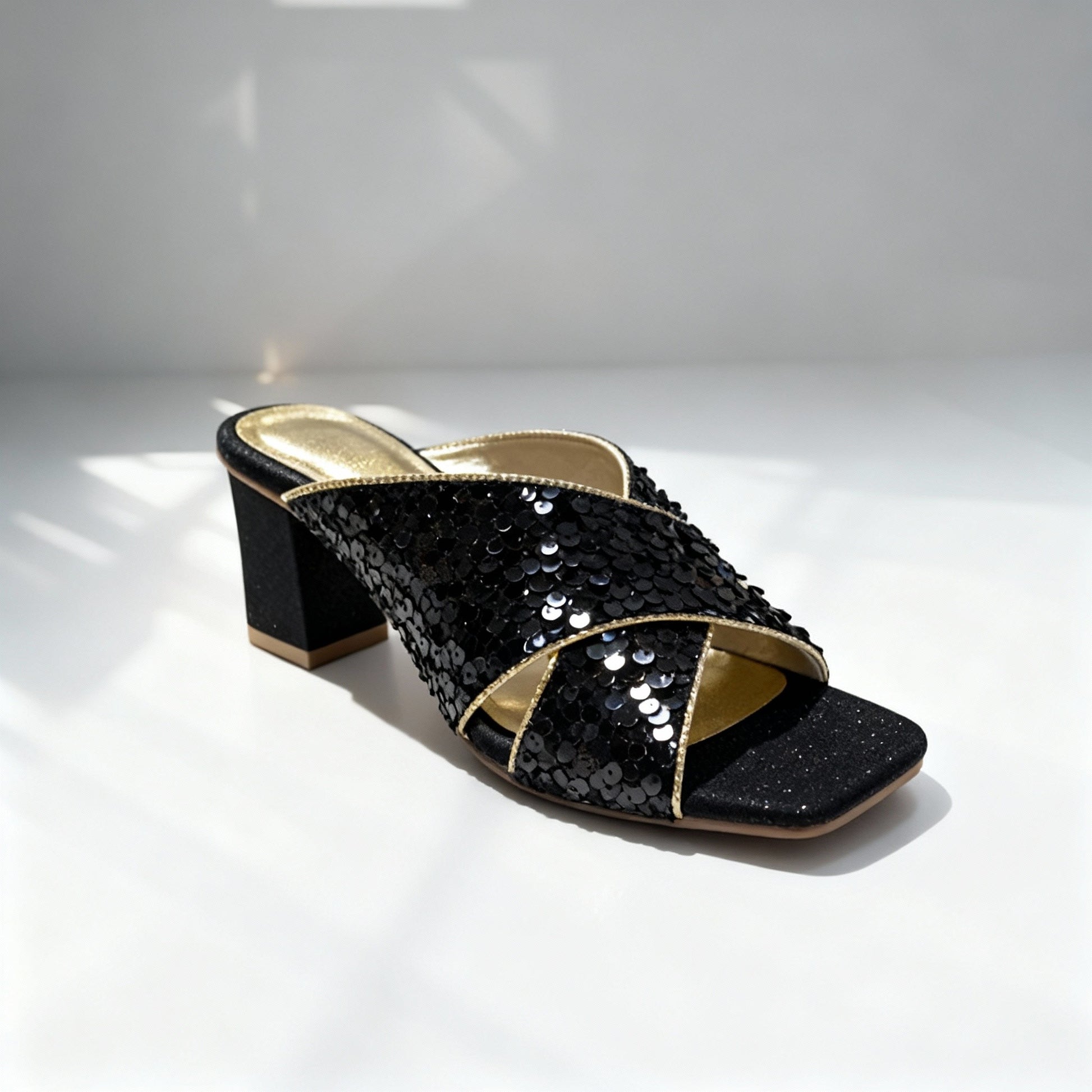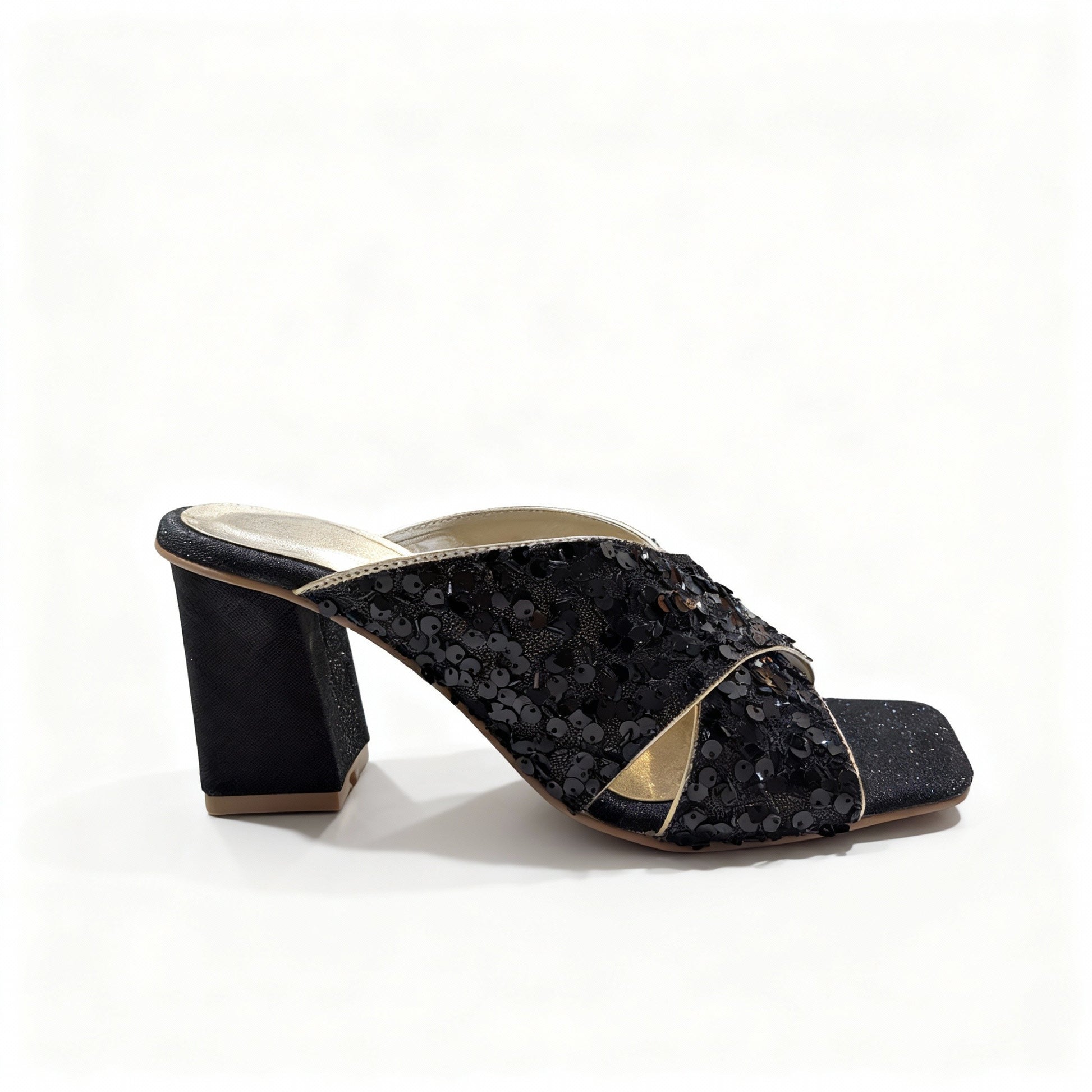 Step into sophistication with Midnight Luxe, a black fancy sandal designed for glamour and comfort.