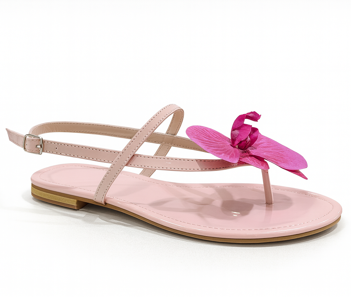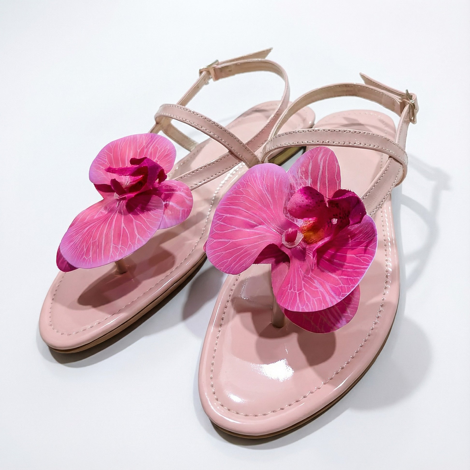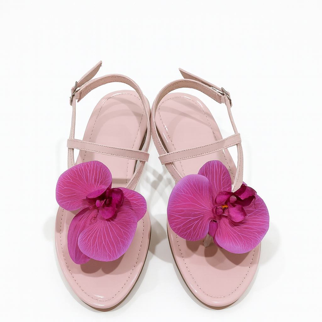 Orchid Bloom brings tropical beauty to your wardrobe. This soft pink sandal features a large 3D orchid flower in striking fuchsia shades instantly transforming your outfit with a fresh, feminine touch. The adjustable ankle strap keeps it secure, while the cushioned base offers all-day comfort. Perfect for summer outings, resort wear, brunch looks, and statement styling.