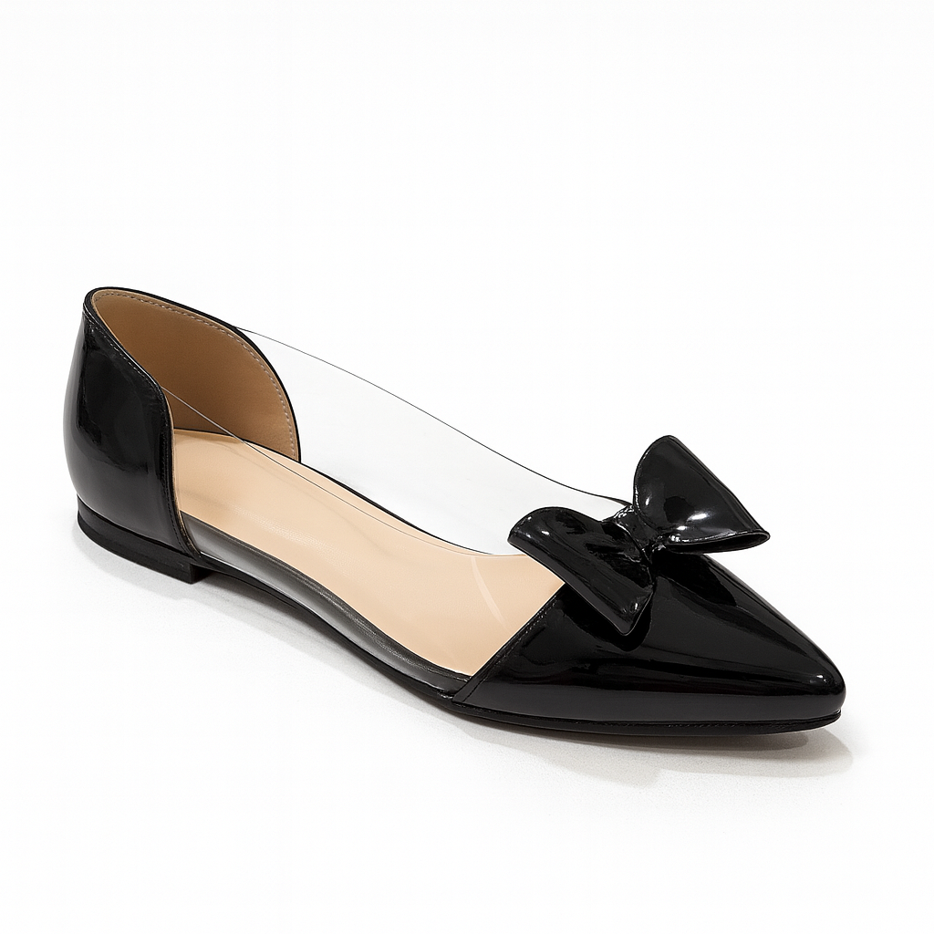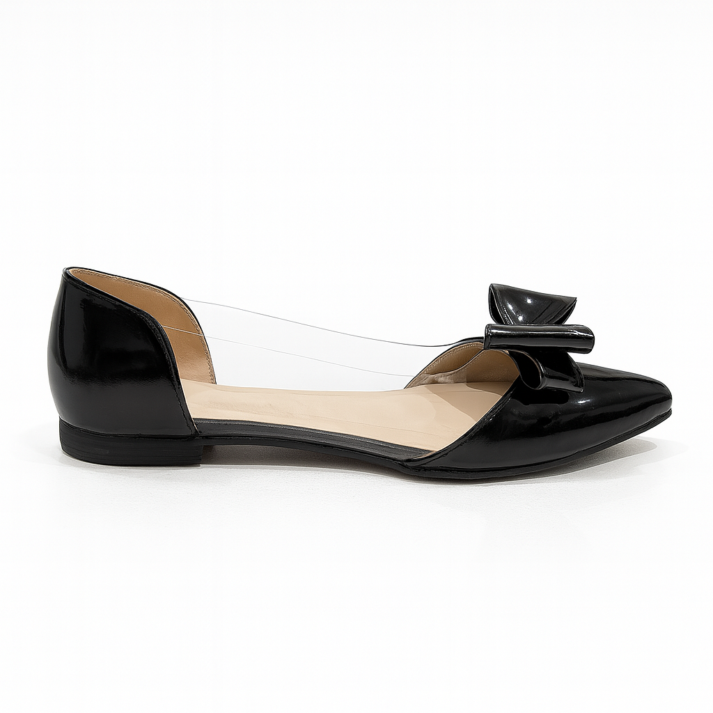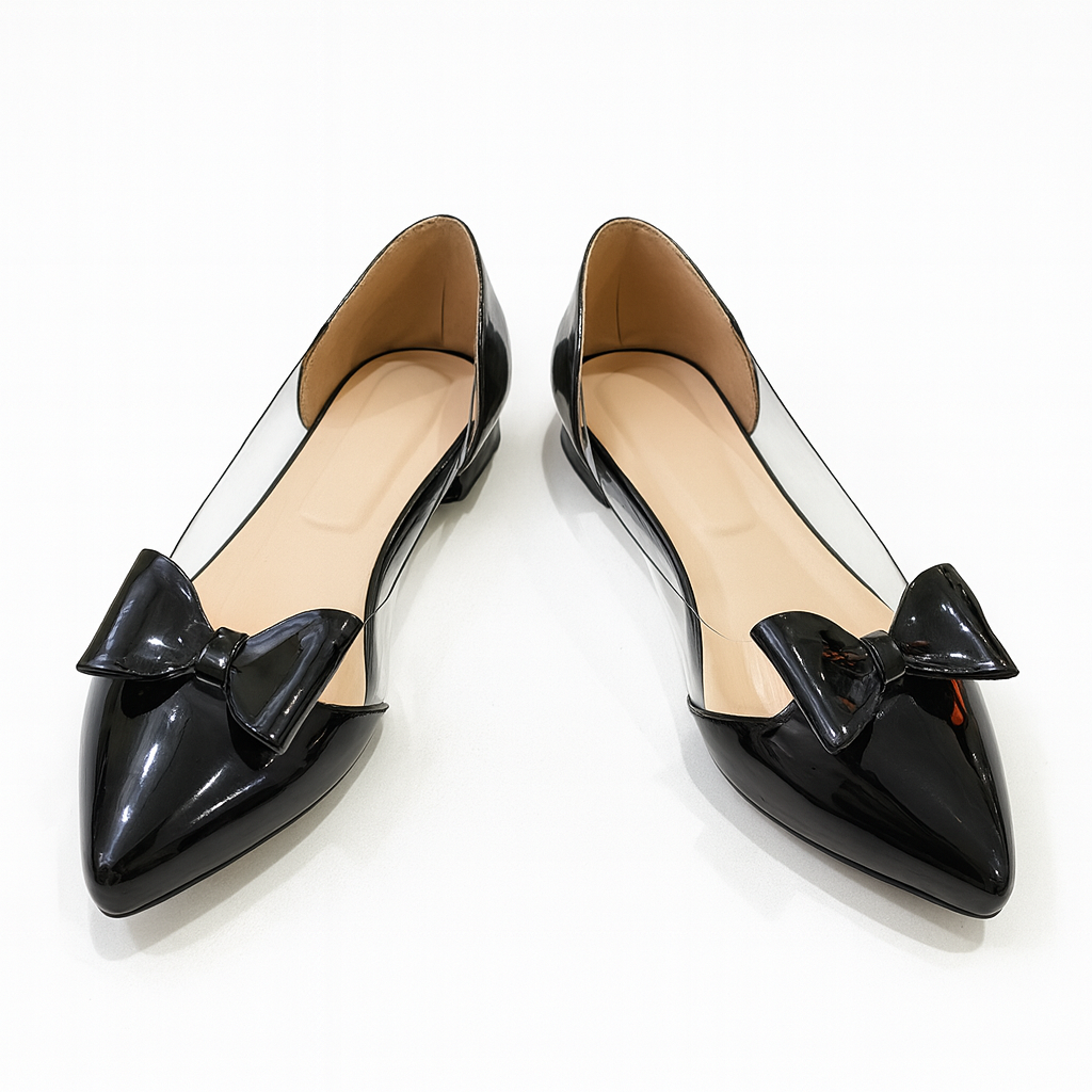 Meet Ravenette, where elegance meets dark allure. These black patent pointed flats channel a Wednesday-inspired, gothic-chic vibe with their high-shine finish, sleek bow, and transparent side panels that add a modern, sculpted look.
